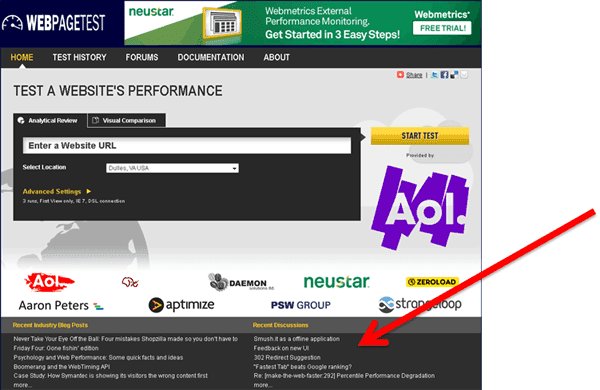 Right at the bottom of the site (across all of the pages) is a blogroll (left column) of performance-focused blogs and a feed of recent discussions (right column) that pulls from the WebPagetest forums, the Yahoo Exceptional Performance group and the “Make the Web Faster” Google group. If you have a blog that you would like included (that is focused on web performance) shoot it to me and I’ll get it added to the feed.
