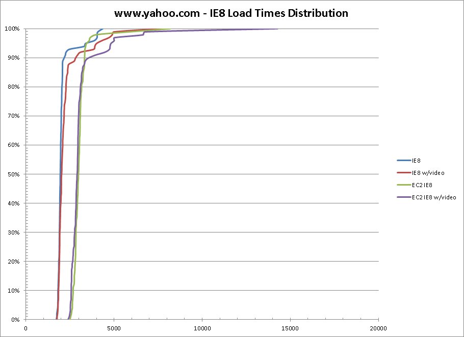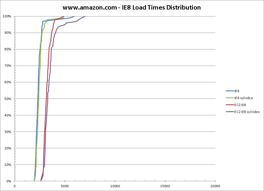 EC2 - The EC2 instances (both IE7 and IE8) are running in the us-east region on “small” instances using instance storage (Windows Server 2003 with 1.7GB of Ram). I had 2 instances of each available for testing so any consistency would not be because of running on the same machine