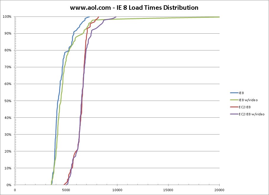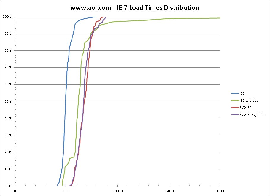 I ran 100 tests each of www.aol.com, www.amazon.com and www.yahoo.com both with and without video capture. These are all sites with sufficient infrastructure to provide consistent serving performance and all leverage CDN’s.