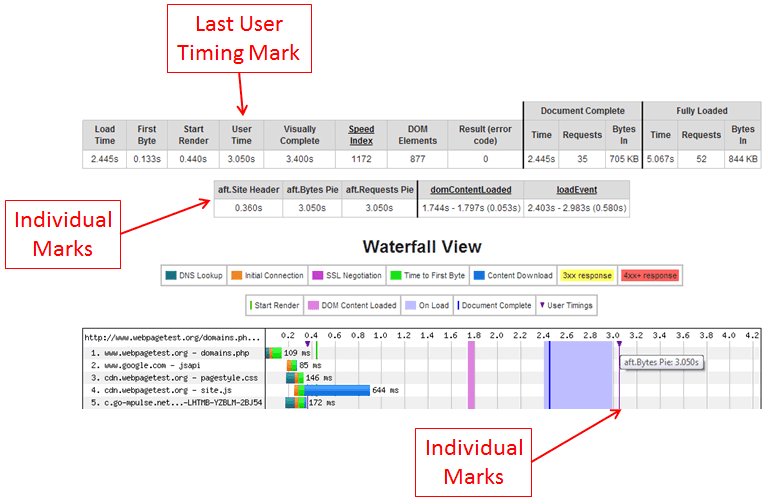Now that you have gone and instrumented your page so that you have good, actionable metrics from your users, it would be great if you could get the same data from your synthetic testing. The latest WebPagetest release will extract the user timing marks from pages being tested and expose them as additional metrics: